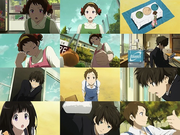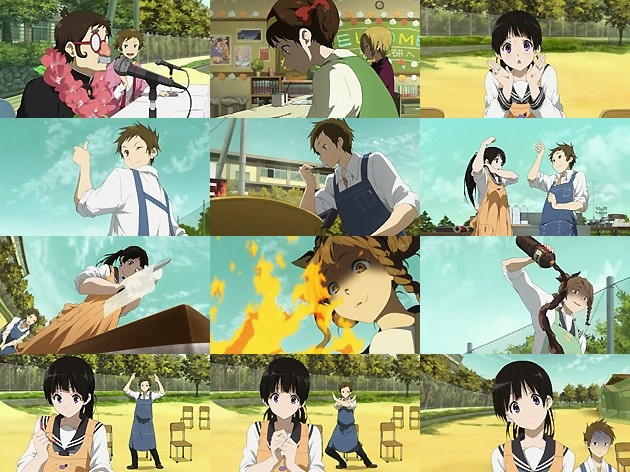 ポスター製作に手間取り、5分遅れで到着した摩耶花。必死にカンヤ祭を駆け抜ける描写の細かさが、さすがの京アニの技量を見せ付けてましたね。 しかし着いたは良いものの、摩耶花に残された食材は小さな玉葱1個とネギと人参の切れ端、そして甘海老の頭だけ・・・これで何が出来る??と悩む摩耶花ですが、あー、あれが出来るじゃん!といきなり答えに辿り着いた私は自炊歴15年。 スピーカー越しの実況で古典部のピンチを知る奉太郎ですが、出来る事は何も無く・・・しかしここで奉太郎は手元に小麦粉がある事に気付きます。そして少し躊躇した後、窓から身を乗り出して大声で里志を呼び付け・・・あの省エネ主義の奉太郎がこのような行動を取るとか!人間変われば変わるもんです。 わらしべ長者方式で得た貴重な食材を受け取った里志は、それを摩耶花に渡し・・・
