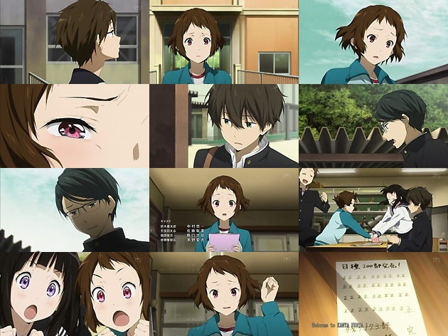 委託分の『氷菓』が完売し、その代金を入須先輩から受け取るえる。その際、入須先輩はえるに放送での語り口調を「お前には合わない」と忠告。それを自分でも感じ取っていたえるは「もう懲りごりですw」と伝え・・・互いに笑い合う事でこの忌まわしい(?)千反田える改造計画は幕を閉じるのでした。 怪盗十文字を捕まえる事が出来なかった里志は、谷から「お前には期待してたのにな」と言われ、谷が去った後に少し感情を摩耶花にぶつけてしまいます。 期待という言葉は自分にそれを成し得る可能性がない人間が使う言葉・・・ここで里志の回想モードに突入。舞台は数刻前、里志が偶然、奉太郎が怪盗十文字の犯人と向き合っている場面・・・奉太郎が突き止めた怪盗十文字の正体、それはこの祭りを仕切る総務委員会委員長・田名辺治朗その人でした。