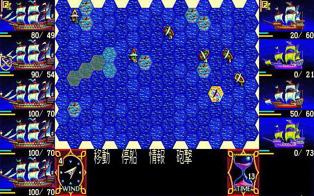 北西から迫る緑色の船団がキュゥべえ艦隊、中央を北上するのがイスラム商船隊です。船の下の数値は、最初が船の耐久力、次が船員数。つまりキュゥべえ艦隊の重ガレオンは耐久力100・船員60名で構成されています。