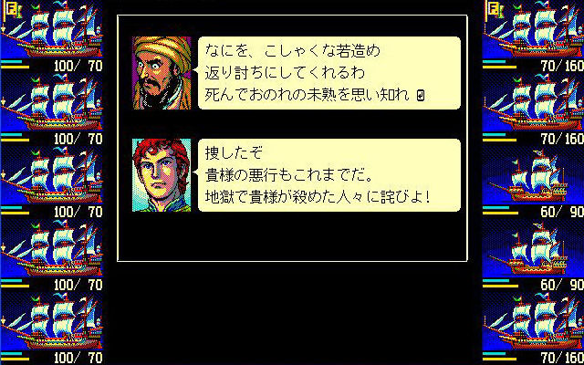 続いて『マミマギカ』号のミゲル提督。統率力・勇気・強靭さが100と、戦闘では一番頼れる男。必殺技はティロ・フィナーレ(お約束)。判断力だけがちょっと低め。倒したと思った相手に油断していると、寝首をかかれるかも?