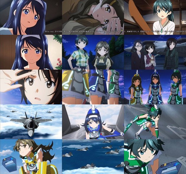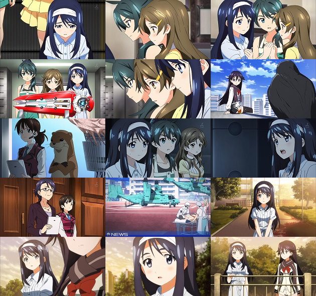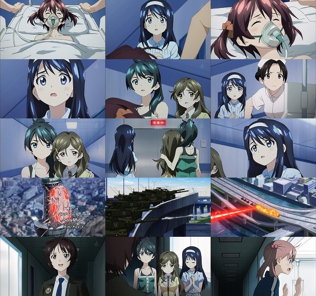 翌朝・・・繭の羽化まで数時間と迫った状況であおいはひとつの決意の下、早暁に家を出ます。そこに現れたのはわかばとひまわり・・・3人の想いは同じようです。 大島空港に配備されたF-35に搭載されるSGE爆弾。あ、ちなみに名付け親の高村和宏監督曰く「スゲエ爆弾」という意味だそうですw 部隊を率いるみずはさんは悲痛な想いと共に出撃の時を待ちますが、その時、夜明けとともに滑走路の向こうから歩いて来る3人の少女が・・・ムッハー!!!このシーンは文句無しに格好良いです!!! F-35の背に乗ってスカイツリーを目指すあおい・わかば・ひまわり。ここであおいたちが考案した作戦が一色博士によって語られます。あおいが囮となってアローンの攻撃を引き受け、その攻撃の際に解かれたバリアの穴をひまわりがビビッドコライダーで数秒こじ開け続け、そこから携帯化したSGE爆弾を握ったわかばが入り込み、アローンにSGE爆弾を叩き込む・・・まさに三位一体の攻撃。そしてF-35の編隊と3人の少女のコラボレーションが美しい。 ・・・でも、これってわかばは特攻隊員みたいな扱いなんじゃ・・・