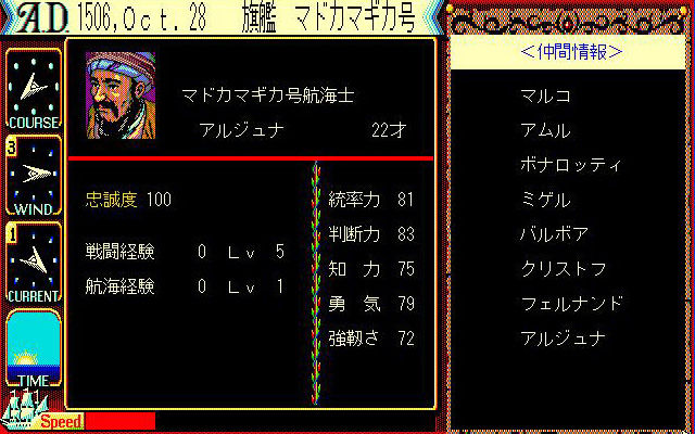 また、カリカットの酒場では新たな仲間が加わっています。このアルジュナという男、イスラム系ながらなかなか優秀な能力の持ち主。このレベルでこの数値という事は、育てて行けばオール100も夢ではありません。
