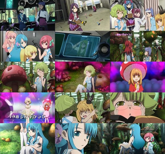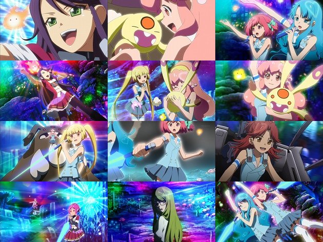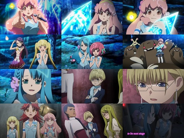 歌で森がひとつになり、デュアリウム結晶の輝きは巨大な光球となってゾディアック機を撃破します。 ゾディアックを破った00メンバーに、フンギーは巨大なデュアリウム結晶を分け与えて友好の印とします。言葉が通じない相手でも、歌を通じて分かり合える・・・この時、智恵理はひとつの決心をします。 デュアリウム結晶の力と00メンバーの歌の力を結合させれば、アキバスター奪還の大きな原動力となる・・・ツバサさんが考えてる所にもたらされる、智恵理と凪沙の行方不明の報せ。智恵理と凪沙はフンギスターから撤退するゾディアックの宇宙船に乗り込み、そのまま智恵理の父親の元へ向かおうとしていたのでした・・・何て無謀な! さて、残り3話でどうやって話をまとめるのか・・・智恵理&凪沙のセンターノヴァ化、アキバスターの奪還、あっちゃんやゆうこたちの帰還と残された課題は多いです。まさか「劇場版につづく」って事はないよね!?