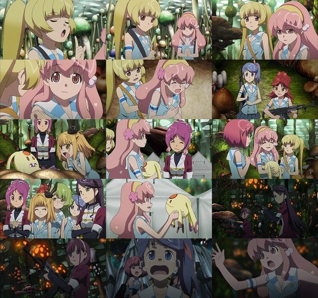 モフフ奪還のため単身後を追おうとする織音ですが、余計な事に関わっている余裕がないのも事実であり、ツバサさんに止められてしまいます。それでもツバサさんの制止を振り切ってまでモフフを探しに行く織音ですが、足元を滑らせて滑落の危機・・・!しかし寸前で織音を追って来た友歌・智恵理・凪沙に助け出されるのでした。 モフフをさらった巨大生物をようやく見付けた織音たちですが、その前に突如謎の戦闘兵器が現れ・・・それがゾディアック社のものである事を見抜いた智恵理。戦闘兵器は巨大生物を駆逐し、モフフをさらった巨大生物にも銃口を向けます。その銃口からモフフを庇う巨大生物・・・織音はここでようやく巨大生物がモフフの母親である事に気付くのでした。 モフフの母親の危機を救ったのは南野さんやたかみなたちのLASでした。こんな場所に居るはずのない0048が現れて戸惑うゾディアックの社員たち・・・。 その後の調査により、この惑星フンギスターがゾディアックのデュアリウム資源採掘惑星であり、原住生物であるフンギーがそのために迫害を受けている事を知る織音たち。しかもゾディアックは、フンギーの子供たちを人質にしてフンギーを誘き寄せる卑怯な手段を用いていると知り、激しい怒りを覚える00メンバーたちです。