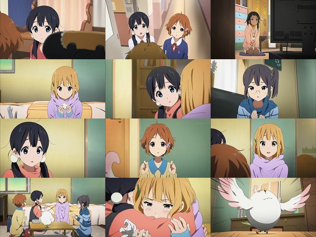 お見舞いの豆大福を差し入れながらみどりの悩みを聴くたまこですが、みどりはなかなかその理由を言い出せず・・・。しかしここでかんながみどりのトイレでの発言と、部屋のゴミ箱に大量に突っ込まれている振り付け案のボツ案を提示し、直球でぶつかって来たことからみどりは遂に振り付けが全く出来ていない事を告白。明るく道化っぽく話すみどりですが、その瞳からは涙がポロポロとこぼれ落ち、鼻水まで垂れ下がり・・・。そんなみどりを優しく抱き締めるたまこ。みどりの悩みに気付いてあげられなかった事を詫びるたまこに、更に涙と鼻水が止まらないみどり。このボロボロの表情はまさに京アニの泣きの真髄ですな。