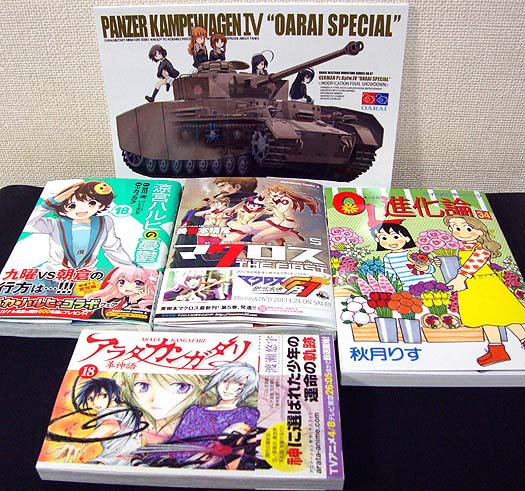 コミックはツガノガク版『涼宮ハルヒの憂鬱』18巻と『マクロスTHE FIRST』5巻、4月からアニメ化も決まった『アラタカンガタリ』18巻、それに1年に1回刊行される『OL進化論』の34巻。同人誌は放蕩オペラハウスさんのガルパン同人誌の第2弾をようやく入手です。