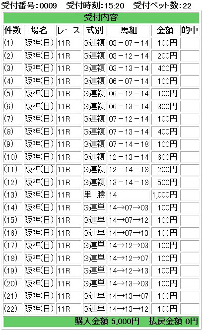 ◎固定軸、◯▲と一部△から流す三連複、◎の単勝、それに◎から三連単を適当に少々