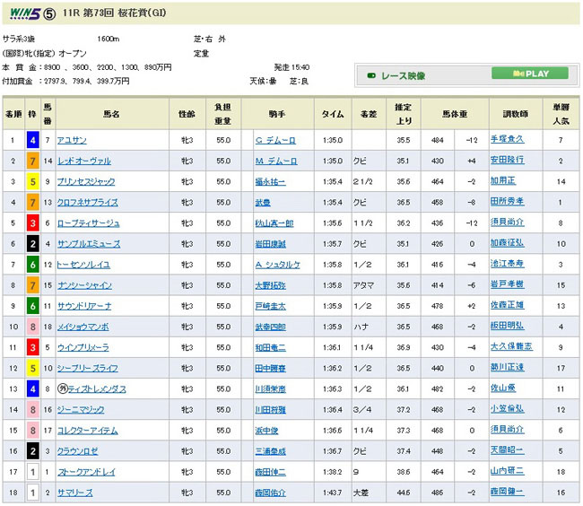 2着:レッドオーヴァル。ミルコ・デムーロは狙った勝利をクビ差で弟に阻まれる事になりました。そしてディープインパクト産駒はワンツーフィニッシュで3年連続の勝利・・・桜花賞との相性は抜群ですな。