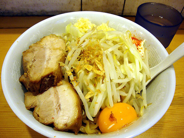 ここの油そばの特徴は、マヨネーズとパルメザンチーズが入っている事ですね。これによってかなり濃厚でコクのある風味が広がります。ニンニクは前回入れなかったので、今回は「普通」に入れましたが、これがかなりキツく・・・「半分」で良かったかな、と学習しました。そこにもやし・ガーリックチップ・卵黄、それに底に敷かれたやや濃い目の味付けの汁を混ぜ混ぜして食べると・・・んまい!(♪テーレッテテー)