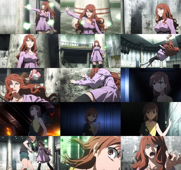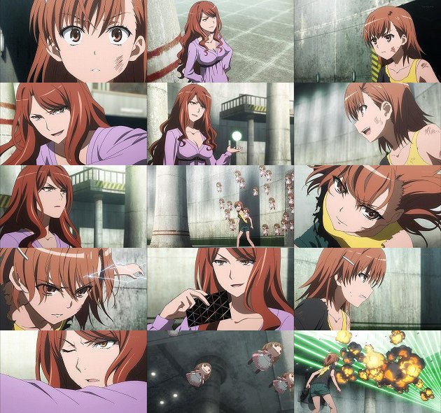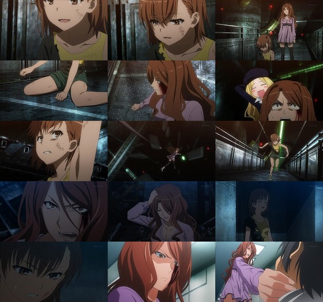 美琴の電撃が学園都市第3位で、自分が第4位である事が気に入らない麦野。その言葉から美琴も相手が学園都市第4位の「原子崩し(メルトダウナー)」であると知ります。 人形爆弾をほぼ使い切った美琴は、最後の1体を囮にして麦野の攻撃を避け、電撃で勝負を決めようとするもその攻撃は麦野の能力によって逸らされてしまいます。しかし隠し玉のもう1体の人形爆弾が麦野の頭部に激突。金属片が仕込まれたそれは、爆発しなくても十分凶器となる存在である事を失念していた麦野・・・元凶となったフレンダと言い、どうにも間抜けですな。それにしても麦野の「勝負はついてたんだよ!レールガン!」という台詞の最後の「ガン!」に人形の激突音を被せた演出は笑いましたなw 強敵をようやく倒した美琴は、広間の奥にある施設の中枢に潜入し、最後の人形爆弾と自らの電撃によってシステムを破壊。ようやく目的を達した美琴が広間に戻ると、倒れていたはずの麦野の姿はそこになく・・・すると突然、至近距離に現れた麦野によって美琴は腹に強烈な蹴りを受けるのでした。美琴VS麦野、最終ラウンドの開始です!