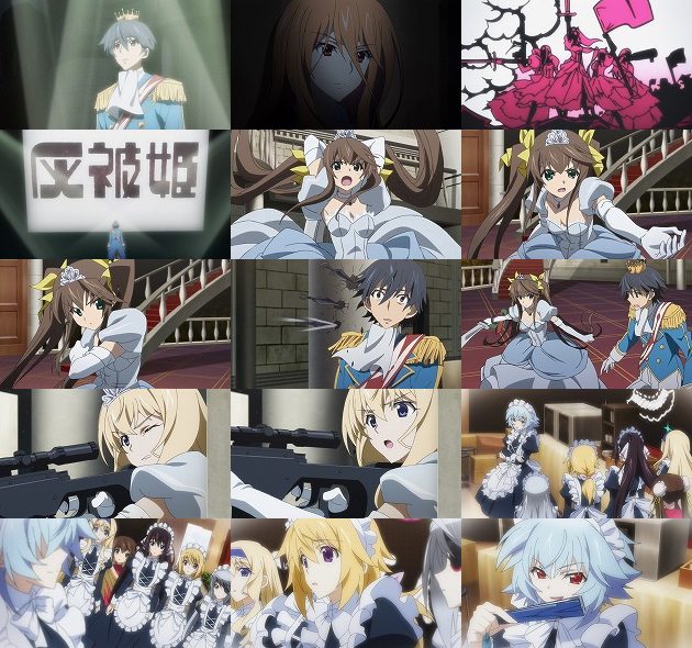 演劇の題材はシンデレラ・・・のはずが、なぜか王子の王冠を狙うシンデレラ姫たちの争奪戦展開へ。まずは鈴が登場し、投げナイフとガラスの靴(注:強化ガラス)で一夏に襲い掛かり・・・いやいや、その破壊力は確実に殺傷能力あるでしょ! 更にセシリアがスナイパーライフルで一夏を狙います。しかも頭部を!って、これも死ぬ、死ぬから!! 彼女たちを本気にさせたもの、それは楯無が事前に提示した条件「一夏の王冠を奪った者に、一夏との同居の権利を与える」でした・・・あー、これは狂う訳だw