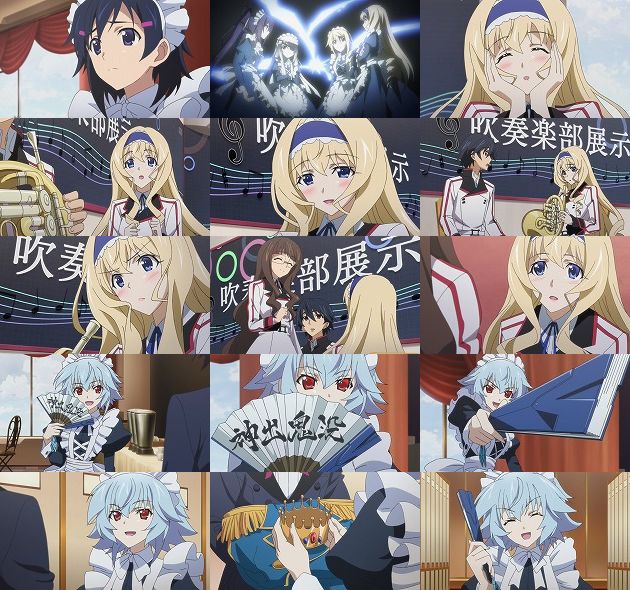 一度に同時に全員で抜けられると困る鷹月さんはジャンケン勝負を提案、そして勝者はセシリアとなります。この辺、鈴→セシリアと順繰りにヒロインたちの見せ場を作っているようにしか思えませんけど。 吹奏楽部の展示に来た一夏とセシリア。セシリアに対し「フルートが似合う深窓の令嬢みたいなイメージ」と言って、またもやフラグを立てる一夏。まさに第一級フラグ建築士です。 一夏が吹いたホルンを手渡され、吹いてみるように言われるセシリア。勿論間接キスを意識するセシリアですが・・・あー、そこそこ、マウスピースをコラ素材にするの禁止な! しかし吹奏楽部員が機転を利かせてマウスピースを交換。あ、この場合気が利かない、が正解か。 短い休憩を終えた一夏が教室に戻ろうとしたその時、神出鬼没の楯無が登場。生徒会の出し物である、観客参加型の演劇に無理矢理出演させられる一夏・・・ここから学園祭そのものが狂って行きますw
