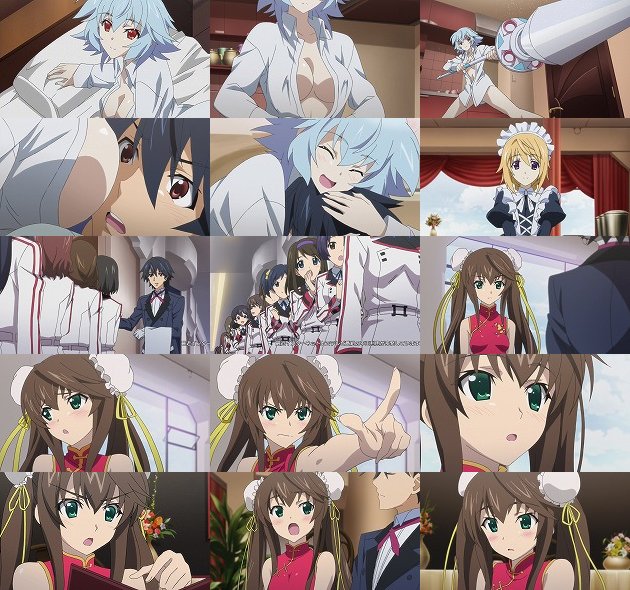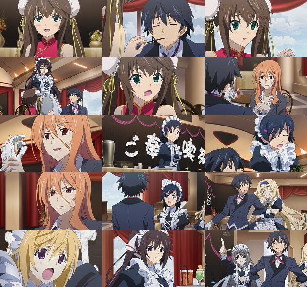 学園祭を前日に控え、疲れた身体を評判の一夏マッサージで癒してもらおうとする楯無・・・つーかその格好でマッサージは、違う方向のマッサージにしか受け取れません。羞恥心の基準が、道着がはだけて悲鳴を挙げていたのと同じ人の物とは思えませんな。 さて、学園祭当日・・・一夏たちのクラスはメイド&執事喫茶。最近のアニメでは当たり前のようにメイド喫茶が出し物として登場しますが、実際にやってる学校って多いんですかね?となると現役の女子高生によるメイド喫茶か・・・じゅるり。 鈴のクラスでは中華喫茶、との事でチャイナドレス姿の鈴。このクラスはどう考えても鈴を売りで考えやがったなw 鈴のいつもと違う髪型を褒めたりと如才無い所を見せる一夏ですが、相手の気持の動きには鈍感なんですよね・・・。フラグ立てまくって未回収とか、何とも罰当たりな男です。 喫茶店で「執事にご褒美セット」を注文した鈴。執事=一夏にポッキーをあーんして食べさせてあげられるというふざけたメニューです。俺は「メイドにご褒美セット」でシャルに自前のジャンボフランクをあーんしてあげたいです。