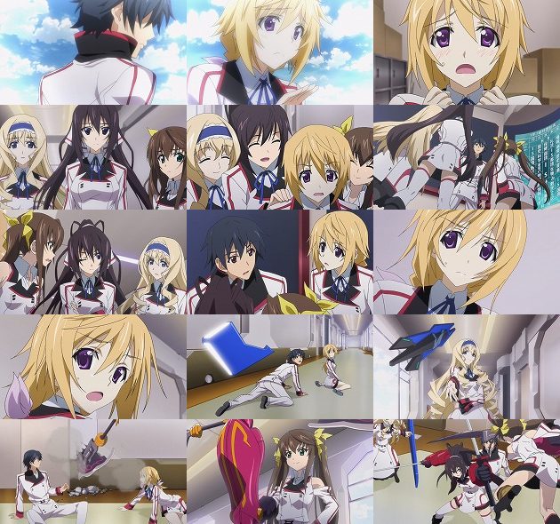 しかしそこに本日ようやく初登場の楯無が現れ、学園最強の肩書きで箒たちを鎮めます。うむ、楯無はあまり前に出過ぎると他のヒロインたちを食ってしまうので、これくらいの出番の方が(初代ヒロイン派としては)丁度良いのですが。あれ?そう言えば先週伏線を張ってた妹の簪の登場はまだですか? 箒たちは罰として校庭のトンボ掛けを命じられ、騒動の発端である一夏は織斑先生に怒られに向かおうとします。そんな一夏を庇うため、シャルは自分の秘密=穿いてない事を伝えるか迷い・・・いやいやいやいや、そこで穿いてないのを告げる意味が分からないwwwww 幼い頃、母親の大事な鏡を割ってしまった事を正直に告げて謝り、許してもらった事を思い出したシャル。だから今度も、素直に一夏に穿いてない事を告げよう・・・いや、だからその発想はおかしいって!!