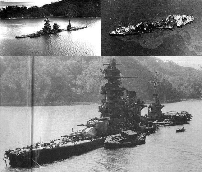 昭和20年に入っても今だ健在だった『日向』ですが、燃料の枯渇によって呉軍港に停泊した状態のまま、3月19日の米空母艦載機による呉軍港空襲に遭遇。3発の爆弾を受けて損傷した『日向』は呉沖の情島に曳航されるも、続く7月24日の空襲で身動きの取れない状態のまま無数の直撃弾と至近弾を受けて大破。そのまま浸水して浅瀬に着底した状態で終戦を迎えました。 写真を見ても分かる通り、艦首は千切れ飛び、爆弾による多くの破孔から流出した重油が攻撃の凄まじさを物語っています。『日向』と『伊勢』の姉妹艦コンビはレイテ沖海戦に囮空母部隊の護衛として参加した際、その優れた対空火力によって多くの米軍機を撃墜しており、呉空襲の際は目の敵にされた、との話もあります。姉妹艦の『伊勢』も『日向』と同じように、呉軍港空襲で集中攻撃を受けて着底して終戦を迎えています。