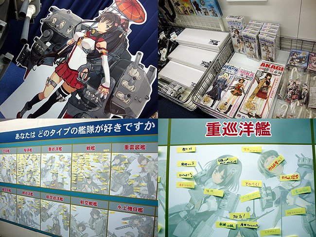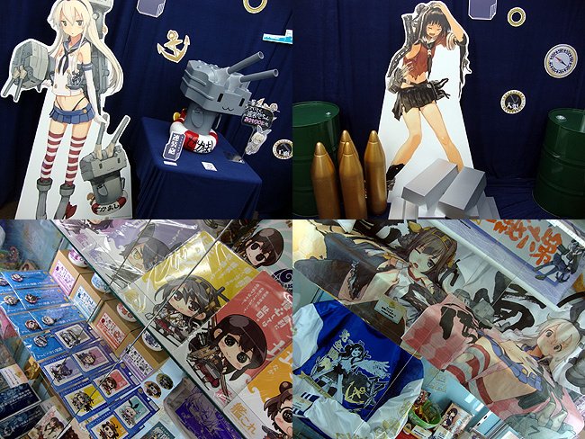 グッズ売り場には様々なキャラアイテムに混じって、ウォーターラインのプラモも売っています。エッチングパーツと艦娘のステッカーも入っているver.のですが・・・あぁ、かつて100隻以上保有していた程の軍艦プラモの作り手としては、今回のブームは本当に血が騒ぎます。わさわさ。