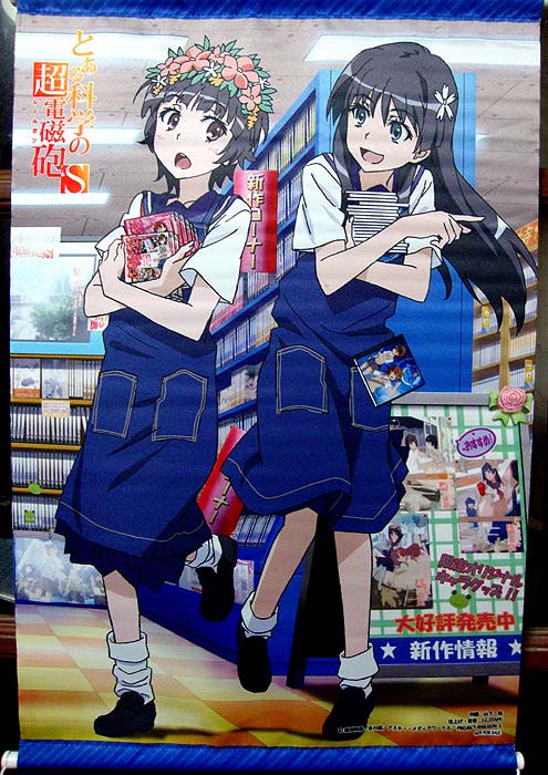 で、これが超電磁砲Sのアニメイト特典のタペストリー。1〜4巻が美琴&黒子だったので、5〜8巻は佐天さんと初春@アニメイト店員服です。何気に手に持っている商品が超電磁砲関連のものばかりですなw