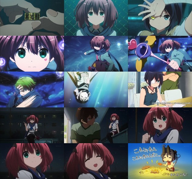 3つのコインを重ね合わせると浮かび出る「水と柱」の文字・・・これ、一番上か一番下が無くても何となく読めるなw それが指し示す場所は橋脚でした(分かり難い!)。そこに隠された箱の中に入っていたのは「暗炎竜」を召喚する魔石・・・勿論ただの石ですが。こんな石っころのために毎夜毎夜街を探索していた六花にちょっとシンパシィ。 その石を川に投げ入れ、六花が中二病空間を現出させると、そこには巨大な暗炎竜が現れます。その姿は天空を舞い、空を覆い尽くすばかり・・・そこに魔法魔王少女の智音が現れ、暗炎竜との戦いを望みます。自分が真に戦う相手、それは勇太と共に現出させられなかったこの暗炎竜!それを勇太に許された智音は壮絶な戦いの末、空に散って行き・・・あ、死んでないのか。 その後、夏休みも終わろうとしている日々。六花は溜まった宿題を泣きながらこなしている頃、暗炎竜との戦いの後も何も変わらない智音が、今日も上階からロープを伝って降りて来ます。何も変わらないのが自分、と告げる智音。しかし最後に智音は笑顔で口にするのでした。 「バイバイ」 これまで別れの言葉は告げないと言っていた智音。これは・・・やはり最終回はそういう展開なんでしょうかね。