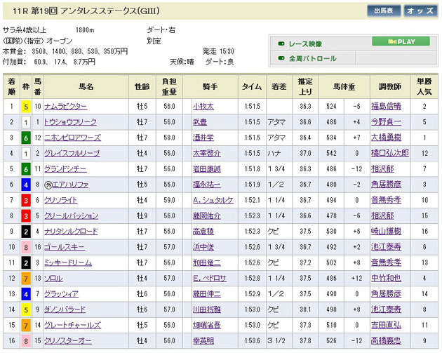 馬券は・・・ニホンピロアワーズからの三連単にしてしまったのでハズレ。でも相手関係を鑑みても、単勝1.8倍は頭を信じたいよなー。あと、期待のソロルが全然ダメでしたな。鞍上のペドロサは今週で帰国。パッとしないままでしたな。