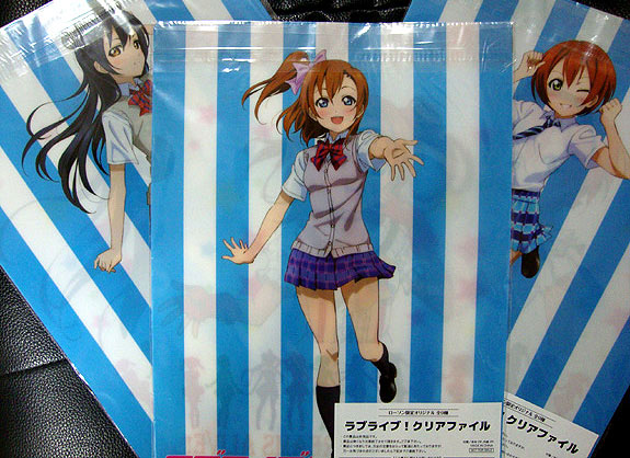 あと、帰りにローソンをはしごして(JRの最寄り駅から家まで歩くと20分ちょっとかかりますが、その間にローソンが4軒もある!)、昨日から始まったラブライブ!とのコラボキャンペーンのクリアファイルを3つ入手。つーか昨日から始まったばかりなのに、1店舗を除いて他の3店舗は既に配布終了・・・おそるべしラブライバーの行動力。