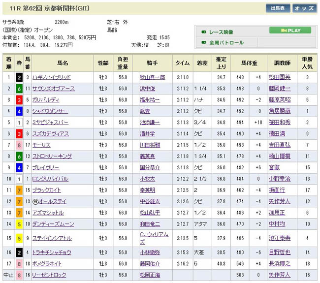・・・しかし、流し軸の3頭が4着・5着・14着で、ヒモ評価だったサウンズオブアースとガリバルディが2・3着に入ったために馬券は痛恨のタテ目。予想を当てて馬券を外す典型的パターン・・・特に武豊のシャドウダンサーのクビ差4着が痛いです。ここは奮起する所だろ〜(;´д`)