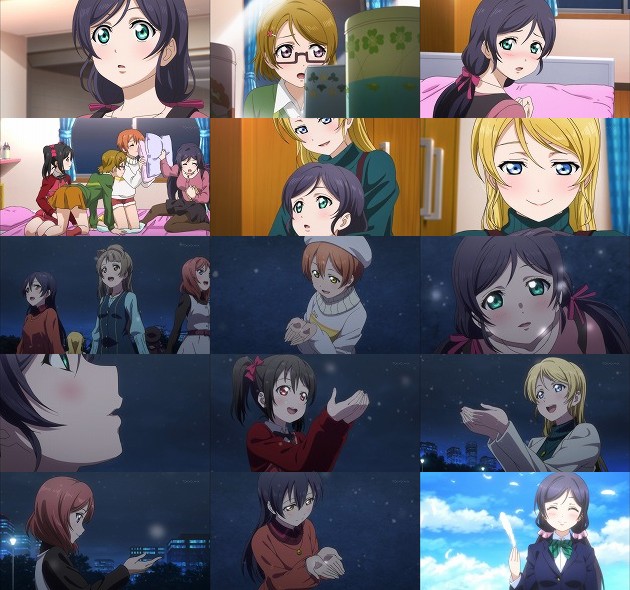 初めて訪れた希の部屋でキョロキョロする面々は、皆で写っている写真が飾ってあるのを発見。照れる希にスキンシップを図ろうとする凛、それを見事に空中迎撃する希・・・さすがは重MS(ぉぃ でもたまにはこういうのも良いでしょ、と優しく諭すエリチカ、マジボルシチ(意味不明)。 そんな時、雪が降り始めている事に気付いた面々は外に飛び出し、全身でその冬のプロローグを受け止めるのでした。 そして皆はその想いをラブソングのかけらとして言葉にして紡ぎ出します。あぁ、何という綺麗な締め方・・・演出には最大の賛辞を送りたいです。