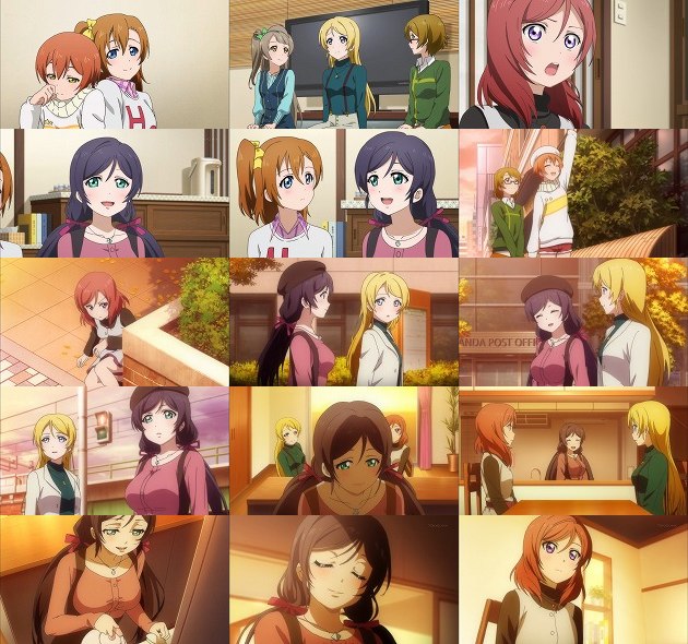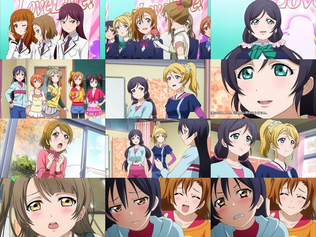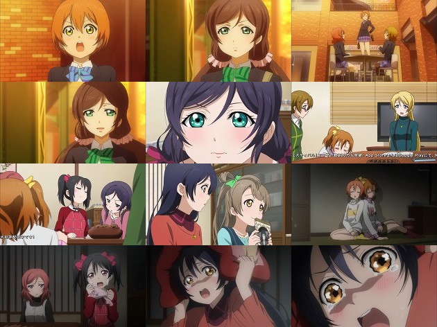 混乱させた上にμ'sを裏切って、エリチカがA-RISEに加入するフラグ!と言い出す凛・・・君、面白いけどやっぱリーダーの器では無いんじゃ・・・。 日曜日に穂乃果の家に集まってラブソング検討会を行う面々。つーか3年生'Sはこの時期そんな事やってて良いんだろーか。 結局全く歌詞が思い付かない事もあって、古い恋愛映画を観て勉強する事になりますが、穂乃果&凛はすぐ寝てしまうし、にこ先輩は感情移入し過ぎて号泣。そして海未は・・・キスシーンを極度に恥ずかしがって直視出来ず、叫びながら強制的に再生中止。あぁ、嫌がる海未に無理矢理AV観せるイベントはまだですか!