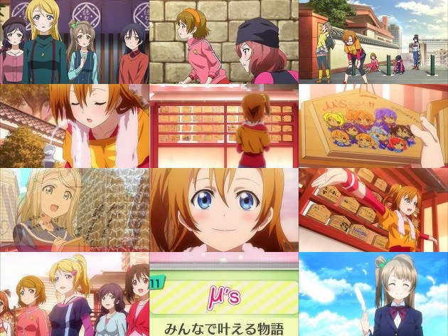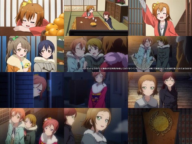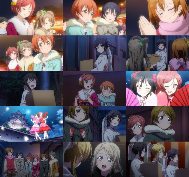 さて、最終予選のステージで終わった先週の話ですが・・・その結果を視聴者に明かさないまま、舞台は大晦日へ。初詣へと穂乃果を誘いに来たことりと海未は、相も変わらずマイペースな穂乃果に振り回されて、穂乃果の着替え待ちの間に新年を迎える事にw まぁ平常運転ですな。 神田明神への道すがら、凛と花陽と遭遇する穂乃果たち。しかしそこにいるはずの真姫は物陰に隠れていて・・・って、真姫だけ晴れ着か!つーかここは全員の晴れ着が観たかったところ。しかし真姫は晴れ着を恥ずかしがるより、その年齢で普通に「ママ」と言ってる所を恥ずかしがるべきのような。 そこに現れたのがA-RISEの面々・・・一瞬走った緊張から、ひょっとしてA-RISEがμ'sを下したのか?とも思いましたが、ツバサがμ'sの健闘を祈る言葉を発した事から、ようやく勝者がμ'sとここで分かります。まぁさすがにここで負ける展開はないかw