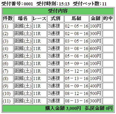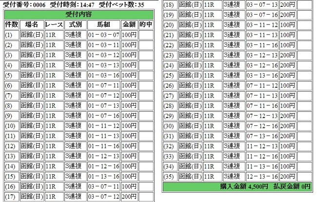 そこで今回は手広く買って穴を狙おう!という戦術で馬券を購入。具体的には、これは削れない!という7頭(アドマイヤフライト・ラブイズブーシェ・アンコイルド・アスカクリチャン・トウカイパラダイス・グランデッツァ・アドマイヤタイシ)の三連複BOX、計35点です。中には9番人気のアドマイヤフライトや、13番人気のアスカクリチャン(去年の春競馬凡走→函館記念3着→札幌記念2着を忘れてませんか?)を絡ませているので、この辺が上手く来れば大炸裂となる馬券です。
