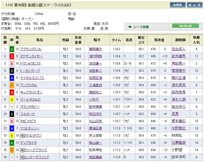 新馬戦を5番人気ながら5馬身ぶっちぎったアクティブミノルが、ここでも逃げ切ってフロックではなかった事を証明!新馬戦では敗れた上、大幅体重増で人気のなかったタケデンタイガーが2着、◎トウショウピストは追い込むも3着までが精一杯・・・。