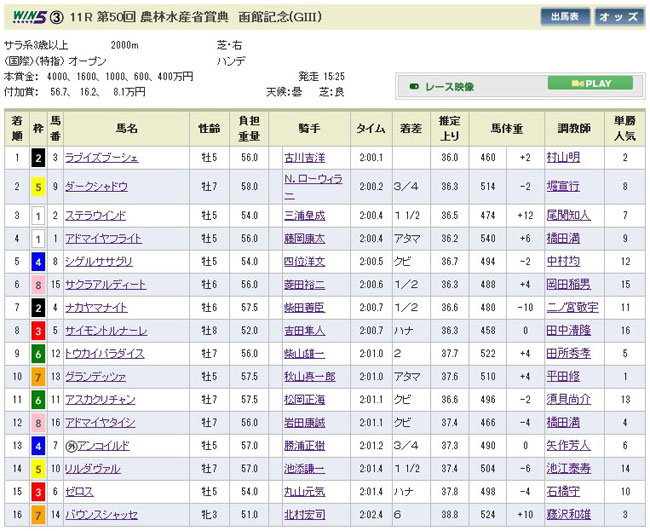 しかしサマー2000シリーズの中にあって、この函館記念と8月の札幌記念はちょっとだけ狙い易い要素があります。それは函館・札幌競馬場のみに施工されている洋芝。この丈の長い芝は得意・不得意がはっきり分かれるので、所謂「函館・札幌巧者」という馬が出て来ます。それらを狙い撃ちするのがこの両重賞の狙い目(もっとも札幌記念はGUという事もあって、有力馬が条件を物ともせずに勝ったりしますけど)。