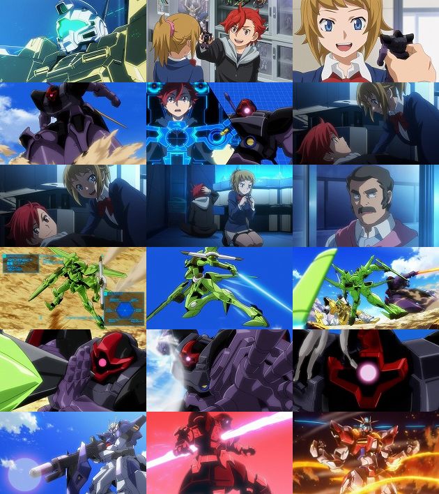 本家をも凌ぐMS描写は今期も健在!第1話では冒頭の宇宙要塞戦に始まり、後半ではセカイが初めてのガンプラバトルでドムを操ります。相手はイナクト・・・世界観も開発コンセプトも全く違うこの2機種のバトルが熱い!しかもドムの中からマトリョーシカよろしくガンダムが出て来る絡繰りw そういやプラモ狂四郎でも、破壊された狂四郎のガンダムの中から1/500ガンダムが出て来てとどめを刺すトンデモ展開があったっけなw