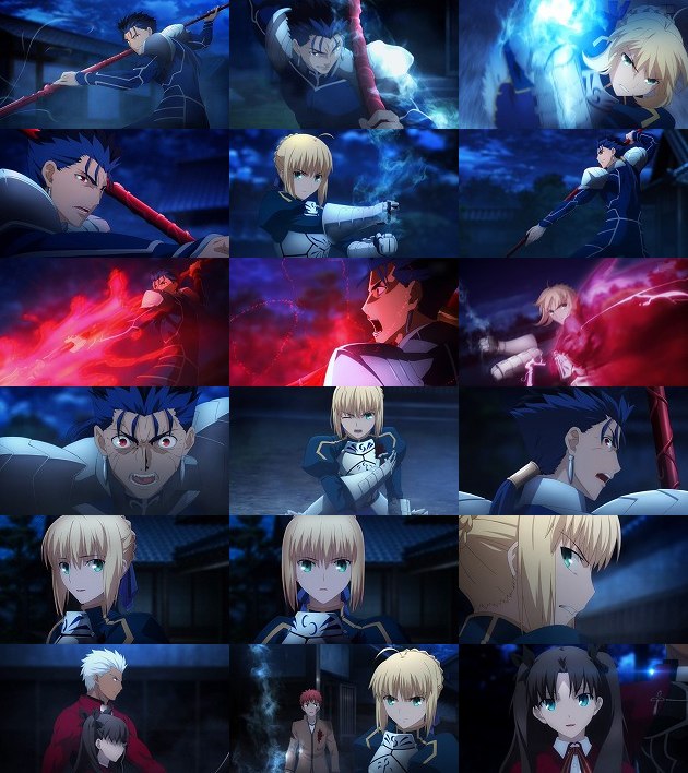 そしてセイバーとランサーの第1ラウンド開始・・・サーヴァント最強と言われていたセイバーが、(s/nでは)小物臭漂うランサーに苦戦し、その上傷まで負わされるのは当時ちょっと意外でした。まぁこの時はセイバーの魔力供給源たる士郎がダメダメだったからなんですけれどね。 そして凛&アチャ男との出逢い=1・2話の締めと結び付けて3・4話終幕。つーかこの1〜4話で1本の映画と言っても良い導入部分でしたな。