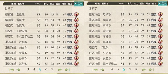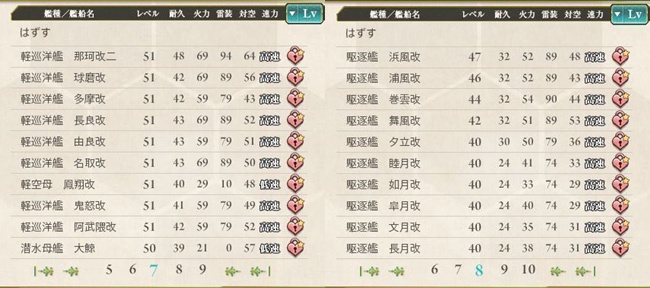 5500トン軽巡の大半がここにいます。他、練習空母の鳳翔や潜水母艦の大鯨など微妙な存在もここまでは育てています。