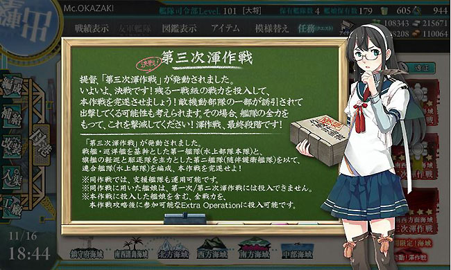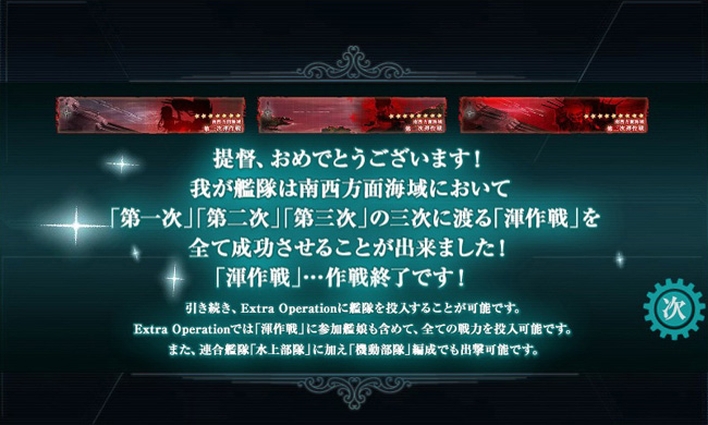 さて、遂に秋イベ通常海域の最終ラウンド・第三次渾作戦(E-3)に進撃です。 E-3はE-1に引き続き、連合艦隊による決戦です。E-1がかなり手緩かったので、今回も連合艦隊を駆使すれば楽勝でしょ!(慢心)