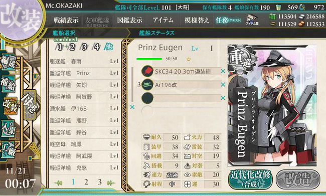 プリンツ・オイゲンの初期スペック。まぁ育てて行けば他の重巡と遜色無い性能にはなるはず。しかし何と言ってもこのプリンツ・オイゲンは、技術立国ドイツ艦らしくその装備が素晴らしい!日本海軍の20.3cm3号砲並みの性能を誇るSKC34 20.3cm連装砲を最初から装備し、偵察機のAr196改も零式艦上観測機並みの能力を持ってます。更にLv.45で改装をすると、もう1つSKC34 20.3cm連装砲を持って来る他、艦これの電探では最強と言えるFuMO25レーダーを持って来ます。命中補正+10というチートレーダーなので、大火力艦に搭載すると凄まじい威力を発揮するかと。