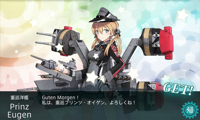 E-3海域の突破報酬は、勲章、改修資材x6、応急修理女神、そして重巡プリンツ・オイゲン!我が鎮守府ではZ1・Z3に続く3隻目のドイツ艦です。島田フミカネ氏の絵が可愛い♪