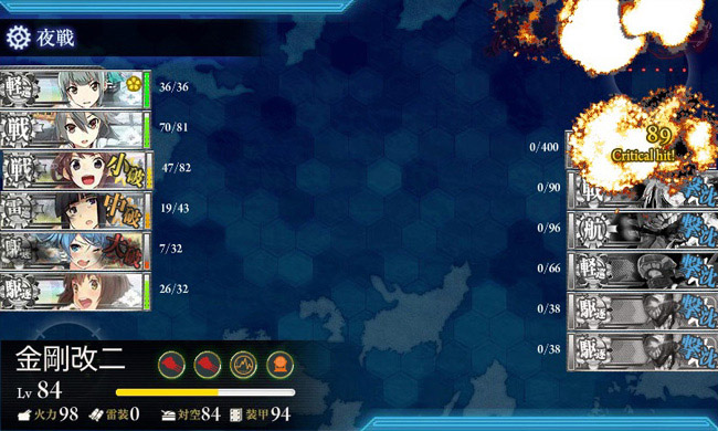その後、攻略組より「第一艦隊:航空戦艦2隻+重巡系1隻+軽巡3隻 第二艦隊:軽巡1隻+駆逐2隻+戦艦系2隻+雷巡1隻」の編成で、道中2戦+うずしおでボスに到達出来るとの報告が入り、再び連合艦隊抜錨!いやー、本当に攻略組の提督たちにはお世話になります。 道中2戦少なくなればもうこっちの物!改二コンビとなった扶桑&山城姉妹を第1艦隊に据え、戦艦棲姫に対して連合艦隊の反撃開始です。再出撃する事数回、第2艦隊の高速戦艦金剛が夜戦で探照灯を照射しながら、自らとどめを刺してくれました。
