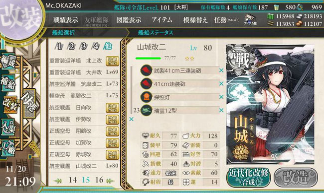 その間、艦これ運営からのちょっとしたサプライズで、11/20に事前予告無しに突然航空戦艦山城の改二が実装!扶桑に合わせて既にLv.80まで上げていた事もあって、早速改二に改修です。 ・・・こちらもやはりどすこいさんだな。