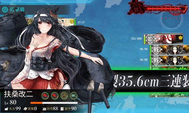 基本的にスペックは扶桑姉さんと同じですね。初期装備で対空噴進砲を持って来るか、探照灯を持って来るかの差だけです。 やはりポイントは瑞雲12型+23機ある第4スロットですね。扶桑とコンビで出撃させれば、第4スロットの装備だけで46機の瑞雲による制空が可能です。