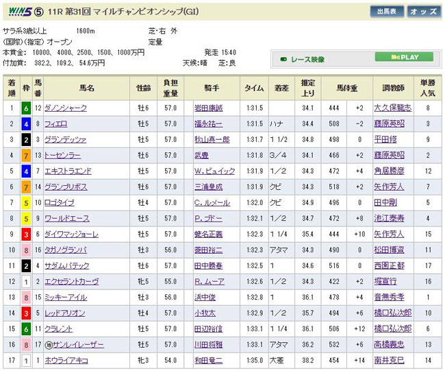 1着:ダノンシャーク。そういやこの馬もディープインパクト産駒でしたが、これはもう完全に騎手の手腕で勝ったようなものですな。特に最後の写真判定を観ると、岩田が馬の首を手で押し出しているのが分かります。何と言う勝利への執念・・・