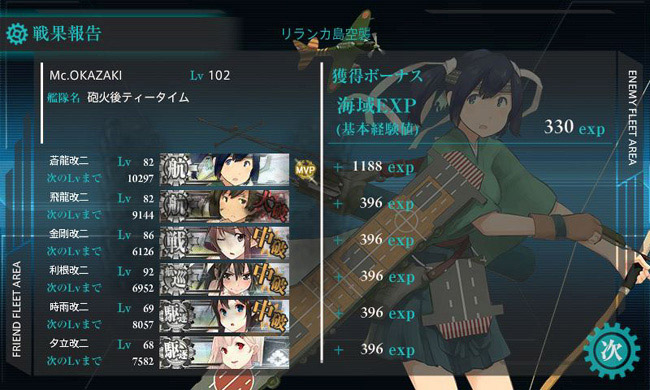 フリー枠にはルート固定のためにまたも利根と、火力面で金剛を投入してチャレンジする事数度・・・運良く比較的早くボスに到達出来てミッションクリア。これにてニ航戦改二ミッションも無事完遂です。