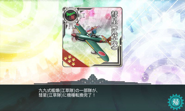 この任務『新編「第二航空戦隊」出撃せよ!』達成後には、艦載機の機種転換任務が2つ発生します。まずは99艦爆(江草隊)+彗星×2を用いて、彗星(江草隊)を入手。艦爆としてはJu-87改と並ぶ最強機体です。