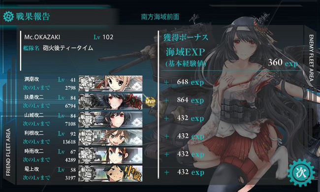 さて、放置単発任務の消化1本目は『「西村艦隊」南方海域へ進出せよ!』。これはレイテ沖海戦時の西村艦隊の5隻(扶桑・山城・最上・時雨・満潮)にフリーの1隻を加えて、5-1ボスにS勝利せよ、というミッション。フリー枠は新たに実装された西村艦隊の構成員である朝雲を加えるのが通ってもんですが、戦力的にあてにならない所もあるので、ここはルート固定+戦力の観点から利根を投入。ホント、この艦娘は能力高いので出番が多いです。