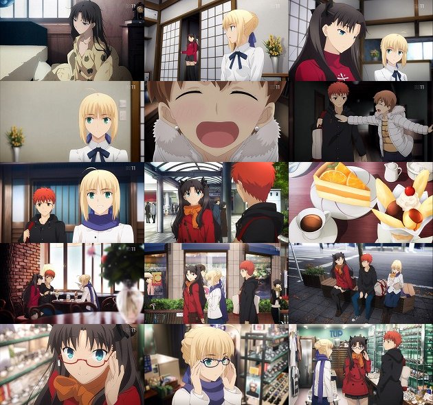 凛が士郎の家に泊まって行った翌日。凛は突然士郎とデートに行くと宣言。護衛のセイバーも含めた3人は、初めてのデートにドギマギが止まらない士郎をエスコートする凛、ポチ状態で着いて行くセイバーという不思議な関係のまま冬のデートに突入。眼鏡屋では凛とセイバーの眼鏡姿も披露・・・理知的な2人は眼鏡もよく似合います。それにしても勝ち気な優等生の貧乳少女と、冷静沈着な金髪貧乳少女を両手の花状態とは・・・士郎羨まし過ぎる(ヒンヌー教徒、心の叫び)