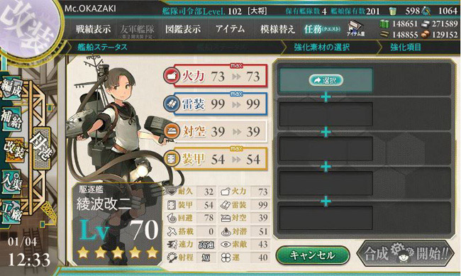 そして昨年末から地道に演習や3-2-1でレベリングして来た綾波がようやく改二レベル(Lv.70)に達しました。今年最初の改二改造です。