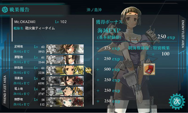 続いて2-5。第五戦隊出撃任務と並行して行うこのステージは、今や妙高型重巡のレベリングの場としてお馴染みです。ようやくLv.60を超えて来て、改二が見えて来た妙高型の面々・・・一応、改二がまだ実装されていない那智も並行して育ててます。