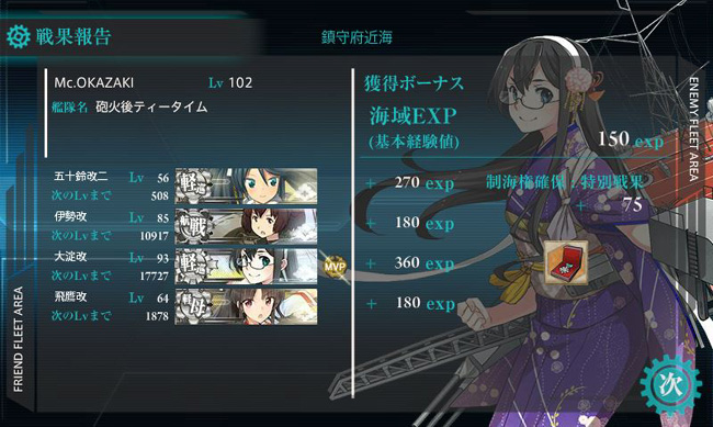 年の変わり目は月の変わり目でもあるので、EOステージのゲージ削りを新年早々行っています。まずは1-5・・・晴れ着の大淀さんが爆雷をばら撒いて潜水艦狩りを行い、まずは勲章1つ目ゲット。