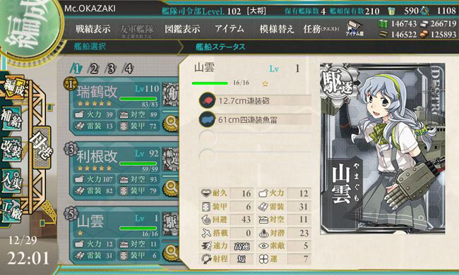 まず、何の予告も無しに12月26日のアップデートで実装された駆逐艦山雲!・・・本当は足柄さんの改二が目玉のアプデだったはずなのにねw