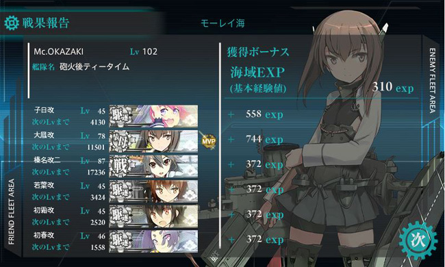 他にも先週金曜日のアプデで新設された任務を幾つかこなしていますが・・・一番キツかったのが第21駆逐隊(初春・子日・若葉・初霜)を含む艦隊による3-1ボスS勝利任務。何しろ元々ランダム羅針盤のためにボス到達率25%のこのマップ。その上、ボス編成で空母ヲ級Fがいるのを引いてしまったりと、何気に20回近い出撃を強いられました。